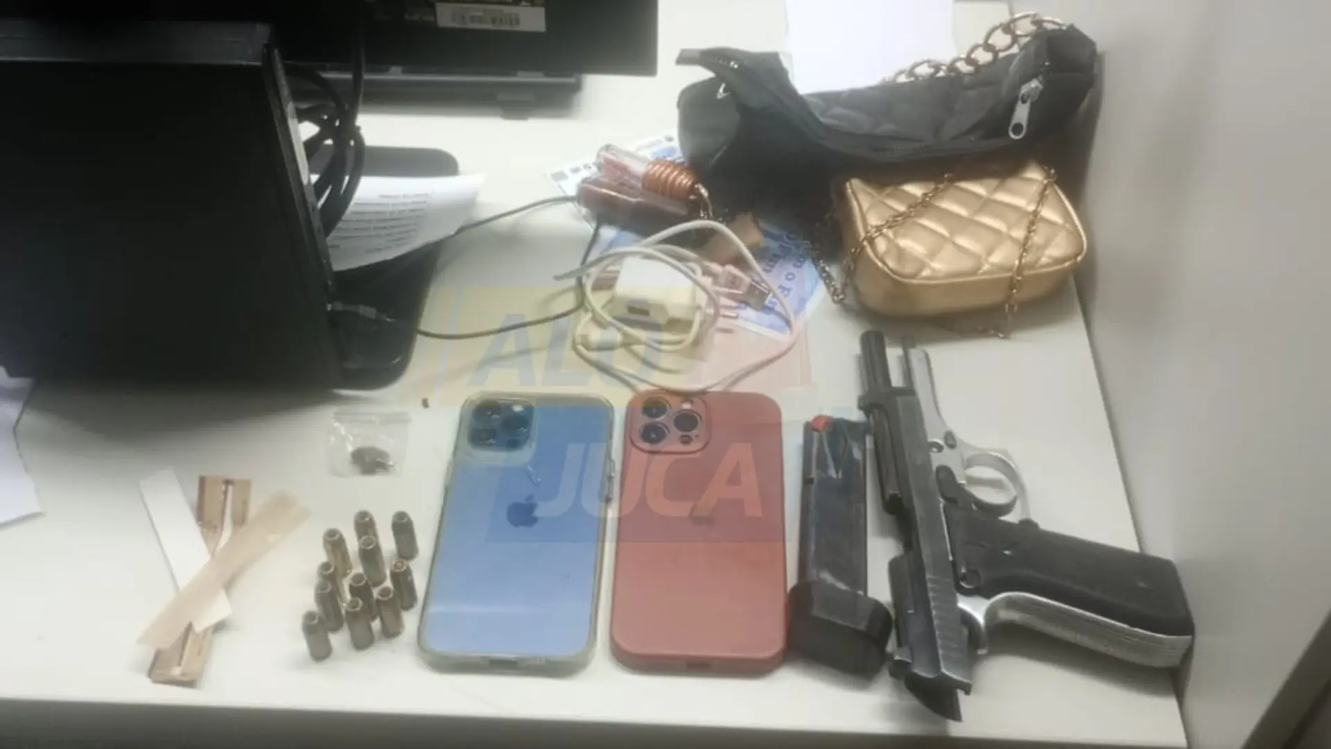 Durante a revista, os policiais encontraram uma pistola calibre .40, com numeração suprimida, e 11 munições intactas. A arma estava em uma bolsa carregada pela passageira da moto. Além do armamento, foram apreendidos dois celulares iPhone e a motocicleta utilizada pela dupla.