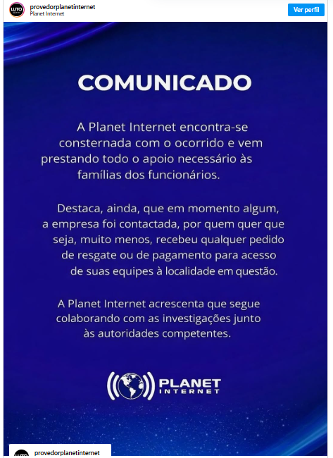 “A Planet Internet encontra-se consternada com o ocorrido e vem prestando todo o apoio necessário às famílias dos funcionários. Em nenhum momento a empresa foi contatada ou recebeu qualquer pedido de pagamento para acesso de suas equipes à região”, informou a companhia.