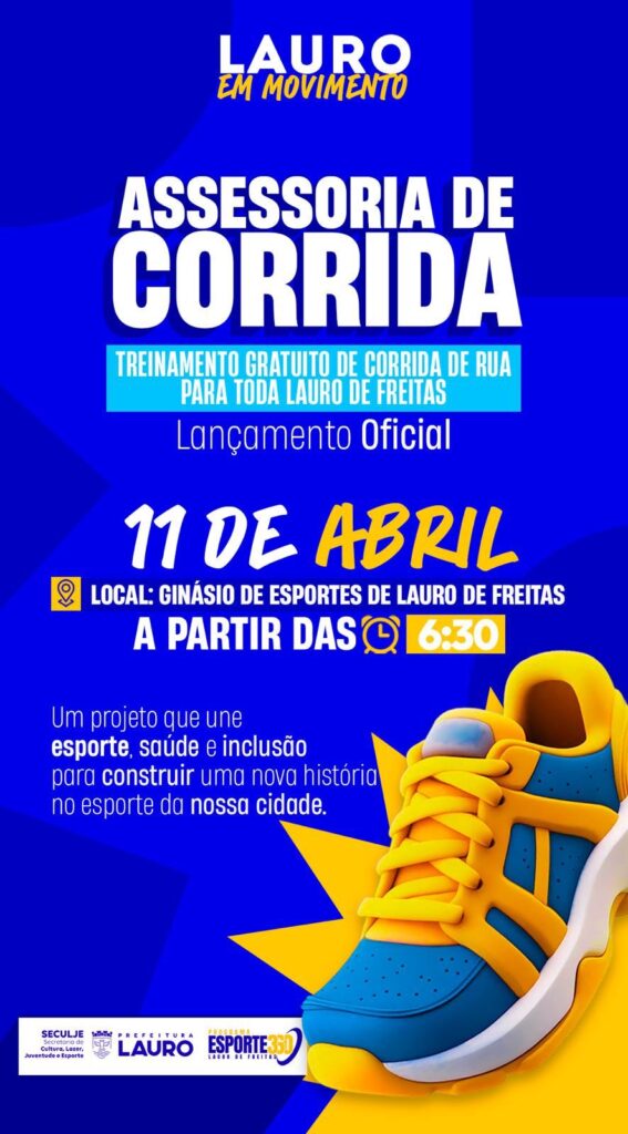 No sábado (11/4), acontece o lançamento da Assessoria de Corrida, no Ginásio de Esportes de Lauro de Freitas, a partir das 6h30. A iniciativa integra o projeto “Lauro em Movimento”, vinculado ao Programa Esporte 360, e oferece treinamento de corrida de rua aberto a todos os públicos, desde iniciantes até praticantes que desejam evoluir.