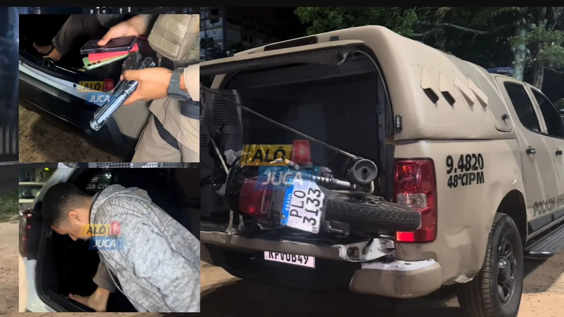 Com o indivíduo, os policiais encontraram diversos celulares provenientes dos crimes, além de uma réplica de arma de fogo usada para intimidar as vítimas. A moto utilizada pelo suspeito também foi apreendida.