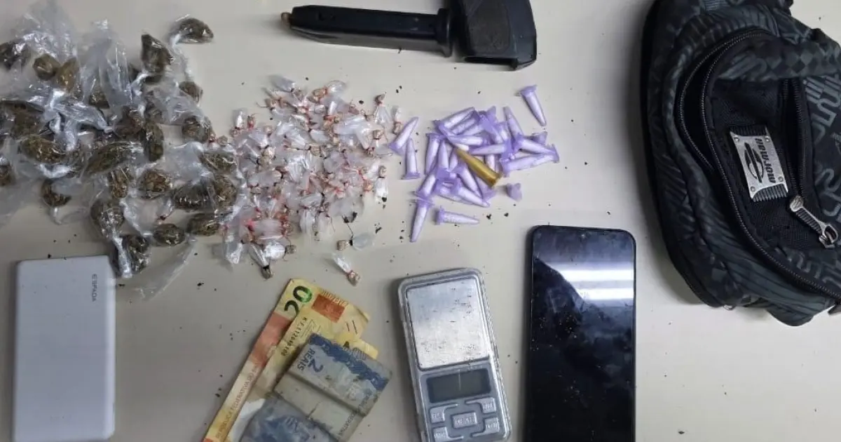 Com ele, foi apreendida uma pistola calibre 9mm com numeração suprimida e um carregador municiado. Também foram encontrados 30 porções de cocaína, 115 pedras de crack, 42 porções de maconha, uma balança de precisão, um celular, uma pochete e dinheiro em espécie.