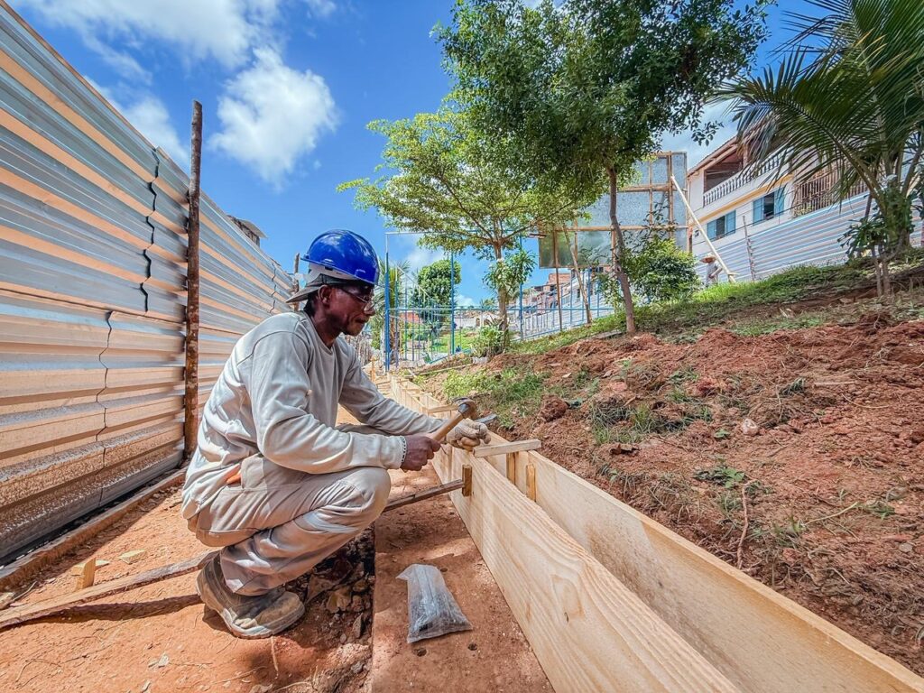 Já na área da praça, os trabalhos avançam com serviços de demolição das estruturas antigas e instalação de meio-fio, etapas iniciais que preparam o espaço para a nova configuração do equipamento público.