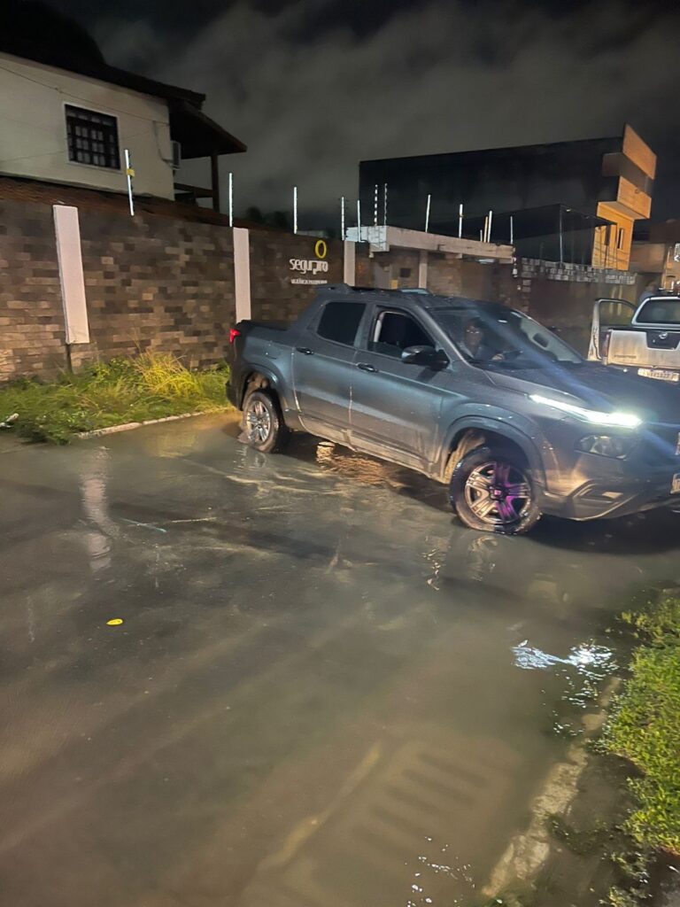 Um veículo ficou ilhado no bairro Pitangueiras, com uma senhora ainda dentro do automóvel.