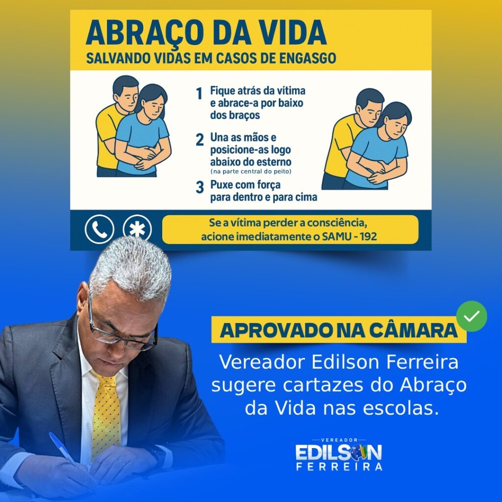 O vereador Edilson Ferreira teve confirmada, nesta data, a aprovação da Indicação nº 211/2025 pela Câmara Municipal de Lauro de Freitas. O documento, de autoria do parlamentar, propõe à Chefe do Poder Executivo Municipal, em parceria com a Secretaria de Educação (SEMED), a instalação de cartazes explicativos sobre a manobra de primeiros socorros conhecida como “Abraço da Vida” em todas as unidades da rede municipal de ensino.
