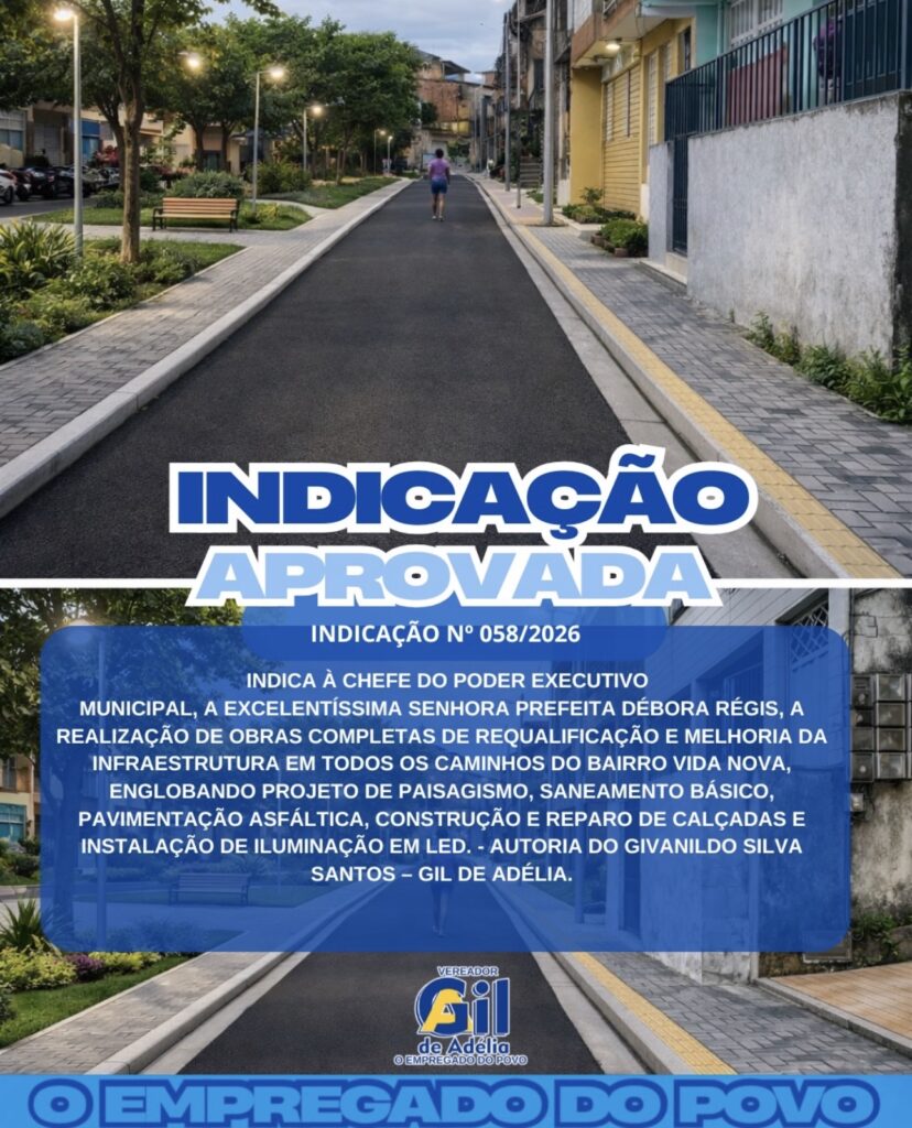 Entre as matérias aprovadas, está a Indicação nº 058/2026, por meio da qual o vereador solicita à gestão municipal a realização de obras completas de requalificação e melhoria da infraestrutura no bairro Vida Nova. A proposta inclui ações de paisagismo, saneamento básico, pavimentação asfáltica, construção e reparo de calçadas, além da instalação de iluminação em LED. A medida busca garantir mais dignidade, segurança e bem-estar aos moradores da localidade.