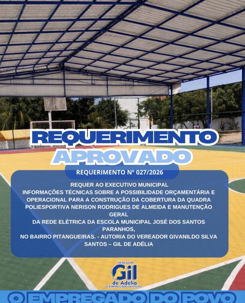 Também foi aprovado o Requerimento nº 027/2026, em que Gil de Adélia solicita informações técnicas sobre a viabilidade orçamentária e operacional para a construção da cobertura da quadra poliesportiva, bem como para a manutenção da rede elétrica da Escola Municipal José dos Santos Paranhos, no bairro Pitangueiras. A iniciativa reforça a preocupação do parlamentar com a educação, o esporte e a segurança da comunidade escolar.